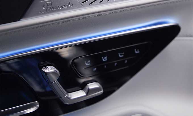 Semelhantes à consola central, as superfícies nas portas também se desenvolvem suavemente desde o painel de instrumentos. O resultado é um gradiente acentuado com pesponto decorativo que emoldura todo o interior e passa pelas saídas de ventilação laterais. O centro da porta foi desenhado como uma sensual topografia estratificada. O puxador também foi desenhado da mesma forma que a consola central e é outra característica atraente. Os materiais utilizados e o estilo das superfícies são repetidos nas portas, criando um equilíbrio no interior. Os altifalantes Burmester de alta qualidade em metal, cujo padrão de perfuração também se destaca visualmente, estão integrados nas portas.