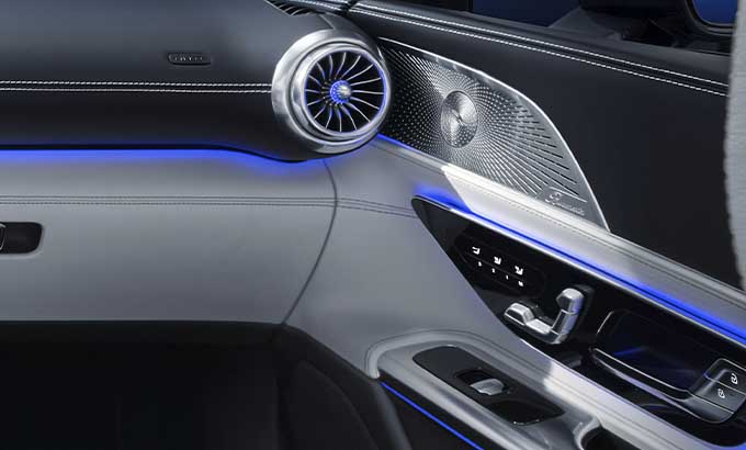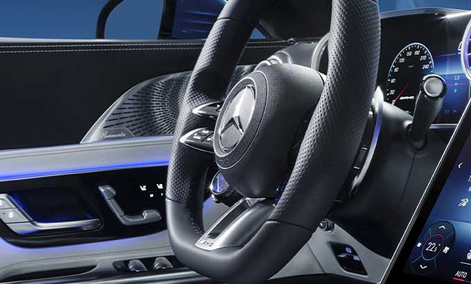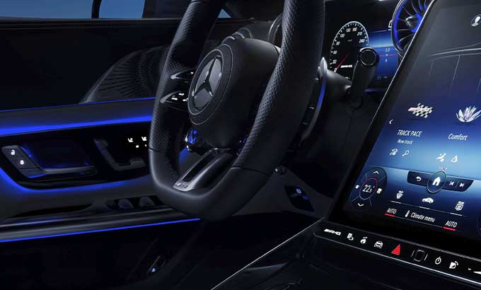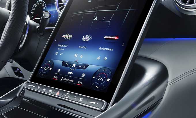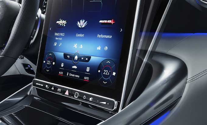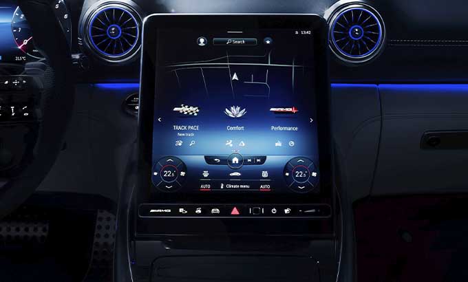 A consola central domina o espaço entre o condutor e o passageiro dianteiro. De máxima largura e subindo acentuadamente até à dianteira, flui até à secção inferior do painel de instrumentos. O centro funcional e visual da consola central é o painel metálico que irrompe as superfícies em pele nas secções dianteira e traseira que, caracterizado pela assinatura de entrada de ar NACA, revela os genes do AMG GT e do GT Coupé de 4 portas. A transição da entrada de ar NACA até ao ecrã tátil multimédia de 11.9 polegadas em formato de retrato, é praticamente contínua. Para evitar reflexões causadas pela luz solar durante a condução com a capota aberta, este display pode ser ajustado eletricamente para uma posição mais vertical. O seu formato de retrato oferece claras vantagens, especialmente para a navegação, e disponibiliza mais espaço. O display tátil flutua entre as duas entradas de ar centrais em forma de turbina, como um contraste digital em relação aos elementos de design emotivo.