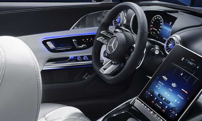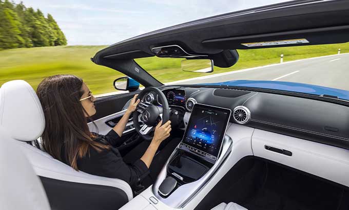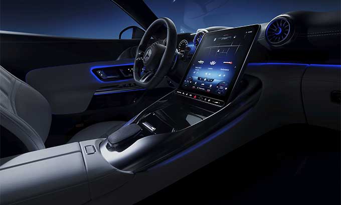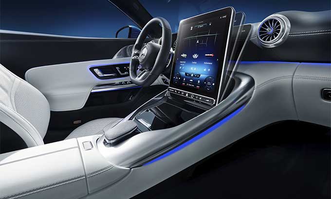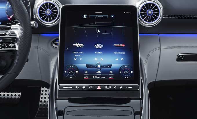 Algumas funções e a estrutura de comando do sistema MBUX de segunda geração correspondem às do Classe S. Foram extensamente complementadas ou substituídas pelos conteúdos e modos específicos da AMG. Isto torna o novo SL extremamente independente em termos de comunicação e de informação. Os modos "Performance" ou "Track Pace" enfatizam o caráter desportivo. O interior tornou-se ainda mais digital e inteligente, pois o hardware e o software foram extensamente aperfeiçoados. As imagens brilhantes nos display LCD facilitam o controlo do veículo e das funções de conforto.