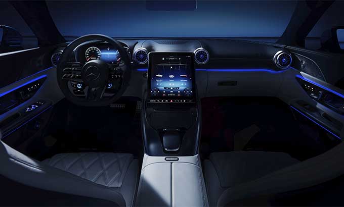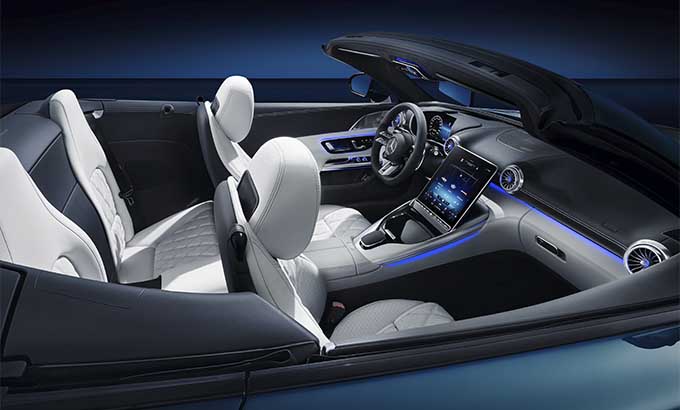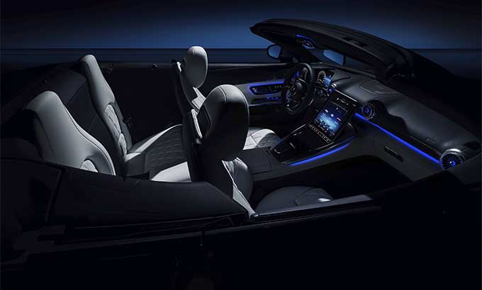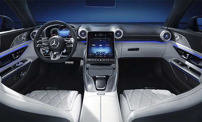 O design interior do futuro modelo SL representa a transformação da tradição icónica do primeiro 300 SL Roadster para a era moderna. Graças aos genes desportivos da Mercedes-AMG, a nova edição vai ao encontro dos requisitos do grupo-alvo desportivo bem como dos clientes que procuram o máximo conforto. Os materiais de elevada qualidade, o fabrico rigoroso e a atenção ao detalhe salientam os elevados padrões de luxo no interior. O design do posto de condução até ao display central na consola central, foi criado com particular atenção para o condutor. O conceito dimensional totalmente redesenhado com 2+2 bancos, oferece simultaneamente maior funcionalidade e espaço no interior. O sistema de informação e de entretenimento MBUX oferece uma seleção de vários estilos de indicação específicos e diferentes modos.