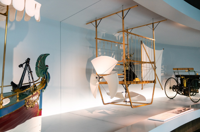 Filigrana: as ripas de madeira do quadro parecem finas, com o motor monocilíndrico Daimler bem visível no meio. Os cordões ligados a estas ripas parecem quase filigranas. Mas o design reflete o objetivo. Afinal de contas, esta gôndola faz parte de uma máquina voadora antiga – e para os pioneiros da aviação da década de 1880, a construção leve era a principal prioridade. Por esta razão, as hélices cobertas de tecido também foram otimizadas para um peso reduzido.