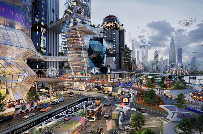 Shenzhen, cidade chinesa com uma rede móvel 5G abrangente, lidera a transformação digital em comparação com Londres e Los Angeles. Em 2040+, o tráfego seria gerido por inteligência artificial, conectividade e infraestrutura digital, com muitos veículos automatizados circulando em faixas exclusivas, conectados por uma "nuvem de estrada de veículos". Devido à densidade urbana, o fluxo de tráfego poderia ser organizado verticalmente em diferentes níveis. A comunicação veículo-para-tudo (V2X) seria padrão, e a logística seria automatizada com robôs e drones. Todos os veículos seriam elétricos ou eletrificados, gerando parte da sua própria energia através de painéis solares. A cidade também contaria com faixas separadas para ciclistas e caminhos definidos para pedestres. Transporte de pessoas e mercadorias seria facilitado por comboios de alta velocidade e VTOLs, enquanto parques e infraestrutura verde nos arranha-céus promoveriam boa qualidade do ar e reduziram o calor no verão.