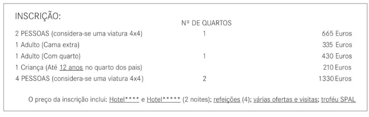 * Data limite de inscrição: 3 de Outubro (sujeito as vagas disponíveis). O custo da inscrição inclui: 2 noites de alojamento em hotel **** e hotel *****; 4 refeições; várias ofertas e visitas, Troféu SPAL e seguro FPTT.