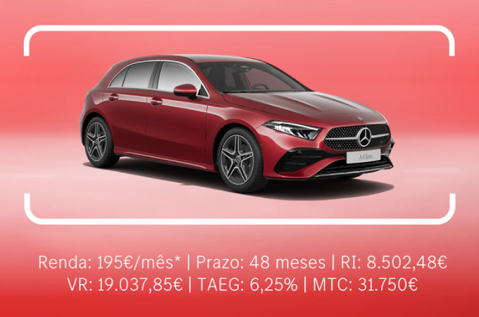 *Exemplo para Mercedes-Benz Classe A200, usado com matrícula 02/2024 em Select & Drive Opção Vantagem contrato Locação Financeira Mobiliária com prazo contratual de 48 meses com renda mensal 195€, Renda Inicial (RI) 8.502,48€, Valor Residual (VR) 19.037,85€, 15.000 Km/ano, TAN (Fixa) 5,85%, Montante Total do Crédito (MTC) 31.750€, TAEG 6.25%, Montante Total Imputado ao Consumidor (MTIC) 36.880,33€. Acresce comissão de ativação de 175€. Despesas de legalização e transporte incluídas. IVA incluído à Taxa Legal em vigor e imagem da viatura não contratual. Mercentro atua como Intermediário de Crédito a título acessório e sem carácter de exclusividade registado com o nº 0000806 junto do Banco de Portugal. Campanha válida para propostas aprovadas até 30/05/2025 e contratos ativados até 30/06/2025 e sujeita à aprovação da Mercedes-Benz Financial Services Portugal SFIC, SA