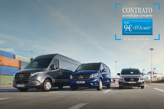 *Campanha para contrato ServiceCare Complete válido para um máximo de 20.000 km / ano, num prazo de 36 meses, na aquisição de qualquer veículo com motor a combustão das gamas Citan e Vito desde 9€ + IVA / mês e Sprinter Furgão e Sprinter Chassis desde 15€ + IVA / mês, com matrícula de 01/04/2023 a 30/06/2022. Estas condições não limitam ou excluem a atribuição de descontos adicionais ou condições mais favoráveis, pelo Concessionário e em caso algum determinam a imposição de um preço fixo ou mínimo.