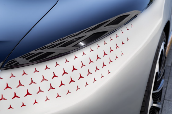 A divisão de cores ao nível da cintura do veículo cria a impressão de uma paisagem envidraçada de "painéis pretos" que flutua na carroçaria prateada – uma superfície perfeitamente interligada, desde a grelha frontal caraterística EQ, até à traseira do veículo.
