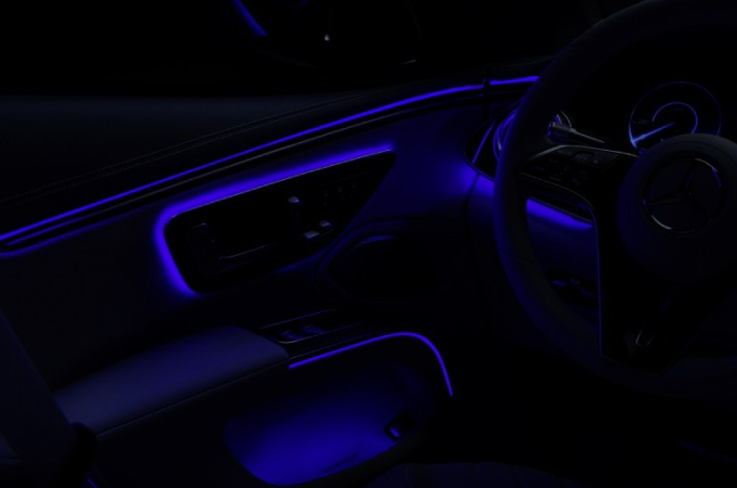 O MBUX Hyperscreen é o destaque absoluto no interior. Este ecrã curvilíneo de grandes dimensões prolonga-se praticamente desde um pilar A ao outro. Estão instalados três ecrãs atrás de um vidro de cobertura que aparentam formar uma única unidade. O ecrã OLED de 12.3 polegadas para o passageiro dianteiro é o ecrã do próprio passageiro dianteiro e a sua área de controlo. As funções de entretenimento apenas estão disponíveis quando o veículo estiver a ser conduzido de acordo com a legislação específica do país. A Mercedes-EQ utiliza uma lógica de bloqueio inteligente com recurso a uma câmara: se a câmara detetar que o condutor está a olhar para o ecrã do passageiro dianteiro, a luminosidade do ecrã é automaticamente reduzida.