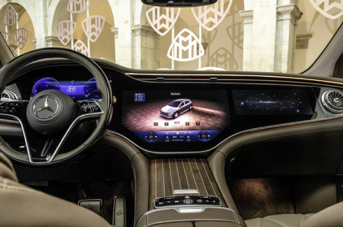 O conteúdo funcional e a estrutura de funcionamento de todos os três displays correspondem aos do EQS SUV da Mercedes-EQ. A aparência dos displays pode ser personalizada com uma seleção de três estilos (discreto, desportivo e MAYBACH) e três modos (navegação, assistência e serviço). No estilo discreto, os conteúdos são reduzidos o quanto possível e coordenados harmoniosamente com a mudança de cor da iluminação ambiente selecionada.