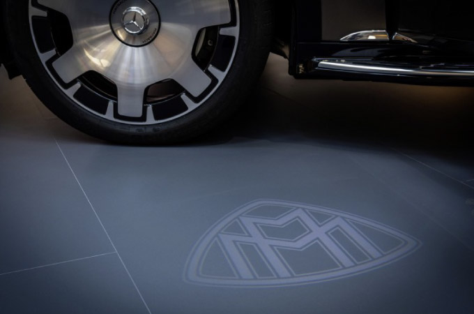 A insígnia Maybach, que está integrada em vários pontos como elemento de design, realça a aparência de elevada qualidade própria da Marca. Adorna os pedais em aço inoxidável, os apoios de cabeça, os encostos dos bancos dianteiros e, na forma de projeção, no piso do compartimento traseiro. Em combinação com o compartimento traseiro de primeira classe, também pode ser encontrada no revestimento de madeira entre os bancos traseiros. Quando o compartimento de carga está aberto, também pode ser vista no revestimento interior da porta do compartimento de carga. A insígnia da Marca diferencia o volante e está também equipada nas proteções das embaladeiras das portas em aço inoxidável, que é iluminada para receber todos os passageiros.