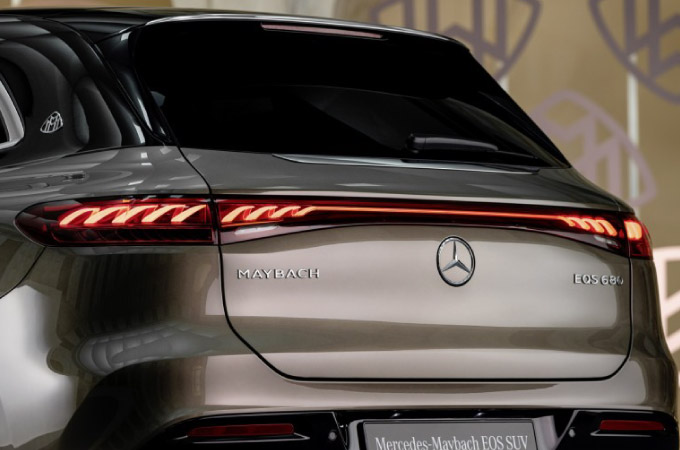 Na secção traseira, os farolins traseiros realçam o carácter de exclusividade com uma faixa de luz contínua e uma hélice bipartida. As luzes são animadas em toda a largura do modelo. Estão também aplicados elementos de revestimento cromados na porta do compartimento de carga, no para-choques traseiro e no spoiler, bem como na inscrição MAYBACH.