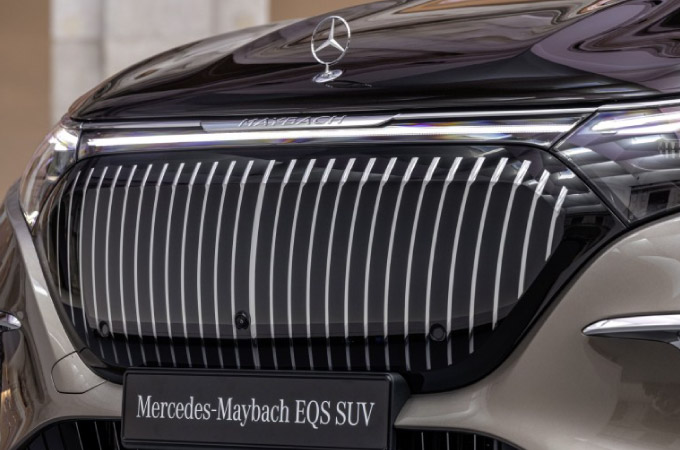 A Mercedes-Maybach enriquece o design dinâmico do EQS SUV da Mercedes-EQ com elementos exclusivos que lhe conferem o seu próprio carácter. A estrela Mercedes assenta de forma destacada no capot, definindo o seu estatuto. A secção dianteira é caracterizada pelo painel preto característico da Marca com faixas cromadas verticais com um visual tridimensional. O painel preto de grandes dimensões é fechado pela primeira vez. Os sensores de radar estão totalmente integrados e já não se encontram visíveis. Nas entradas de ar do para-choques também estão instaladas aletas cromadas. A inscrição clássica MAYBACH está discretamente incorporada num friso decorativo cromado, que forma uma unidade com a faixa de luz contínua dos faróis DIGITAL LIGHT, de série. O padrão Maybach com várias pequenas insígnias da Marca também pode ser encontrado nos componentes de revestimento do para-choques. Os faróis DIGITAL LIGHT recebem e despedem-se do condutor com um esquema de luz especial. Uma animação do padrão Maybach é projetada nas quatro portas como uma saudação adicional.