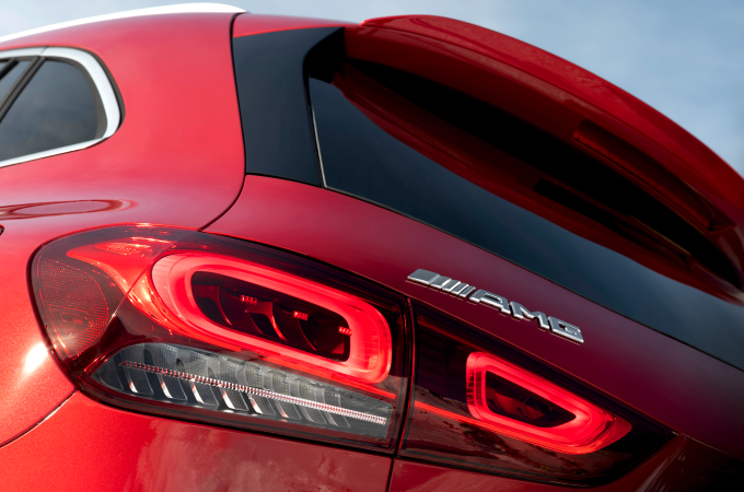 A grelha do radiador específica da AMG acentua visualmente a filiação do modelo à família AMG. Outras características diferenciadoras incluem o revestimento das lamelas nas entradas de ar exteriores e o repartidor dianteiro em cromado prateado, ou opcionalmente em preto brilhante. As suas características atraentes quando observado de lado são, por exemplo, as jantes de liga leve de 5 raios duplos e de 19 polegadas e os painéis das portas com aplicações em cromado prateado ou preto brilhante (opcional). A secção traseira é dominada pelo atraente para-choques traseiro com um novo difusor, o pequeno spoiler AMG no tejadilho e os dois revestimentos redondos das ponteiras de escape nos lados esquerdo e direito. Os elegantes farolins traseiros bipartidos conferem uma impressão de maior largura à traseira do GLA. Com as características de design em preto brilhante, os vidros escurecidos desde o pilar B até ao vidro traseiro e os revestimentos das ponteiras de escape em cromado preto, o opcional pack AMG Night assegura um visual do modelo ainda mais personalizado.