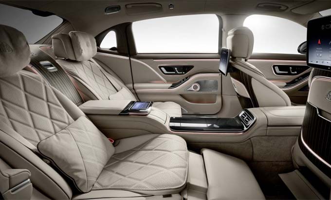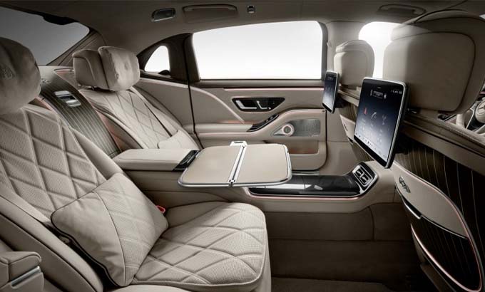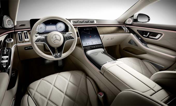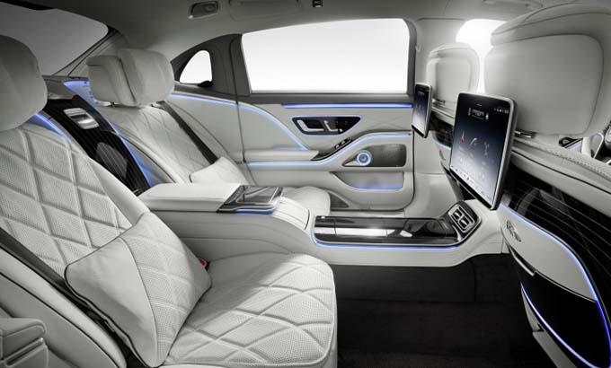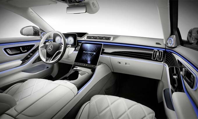 O interior do Mercedes-Maybach Classe S tem por base o revolucionário design interior do novo Mercedes-Benz Classe S. O visual esculpido do tablier, a consola central e o apoio de braços aparentam flutuar numa paisagem interior em expansão. No Mercedes-Maybach Classe S, também os equipamentos de luxo digitais e analógicos são harmoniosamente combinados. Estão disponíveis até cinco ecrãs. De série, o modelo está equipado com um ecrã central OLED de 12.8 polegadas, que constitui a interface do utilizador para o controlo das inúmeras funções tecnologicamente avançadas. Está disponível como equipamento opcional um ecrã do painel de instrumentos de 12.3 polegadas, com representação tridimensional dos outros utentes da via, profundidade pronunciada e efeitos de tonalidades.
