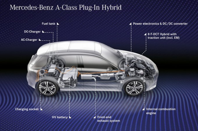 A família de compactos da Mercedes-Benz está equipada com motores instalados transversalmente. Foi desenvolvido um grupo propulsor híbrido compacto para a caixa de velocidades de dupla embraiagem 8G-DCT que segue os mesmos princípios tecnológicos dos componentes nos veículos com motor instalado longitudinalmente. Pela primeira vez num Mercedes-Benz, o motor de combustão é ligado pelo motor elétrico - os modelos híbridos compactos não estão equipados com um motor de arranque separado de 12 V.