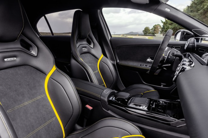 Os modelos A 45 S e CLA 45 S incluem ainda mais elementos de destaque – aplicação de elementos na cor amarelo em todo o interior do veículo para enfatizar o carácter desportivo dos modelos mais potentes. Também incluído no equipamento de série, o volante AMG Performance em pele/microfibra DINAMICA com pesponto contrastante em amarelo, uma marca amarela na posição das 12 horas, botões e logótipo AMG no volante, e ainda iluminação ambiente.
