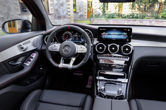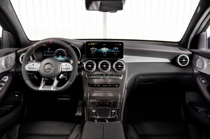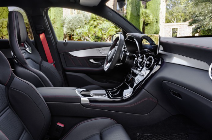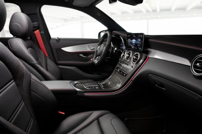 O design interior dá continuidade ao idioma de design desportivo do exterior e ajuda a realçar as ambições dinâmicas do novo GLC 43 4MATIC. O SUV desportivo está equipado de série com bancos desportivos, que oferecem um apoio lateral superior ao condutor e ao passageiro dianteiro. O revestimento dos bancos em pele sintética ARTICO/microfibra DINAMICA na cor preto e os pespontos contrastantes em vermelho, evidenciam uma configuração distintiva dos bancos. Os elementos de revestimento em alumínio com textura granulada longitudinal destacam as aspirações desportivas do veículo.