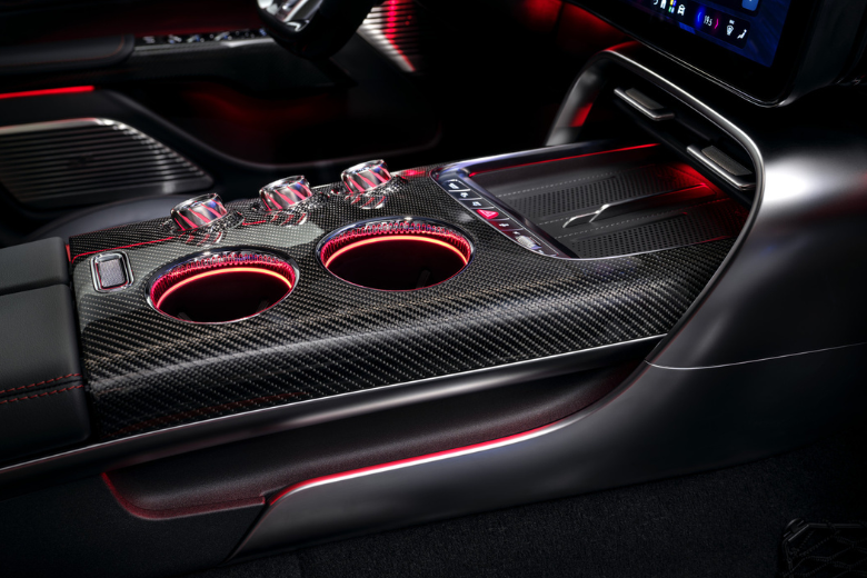 Um dos destaques do design do interior encontra-se na consola central: três comandos rotativos de dinâmica de condução permitem ajustar instantaneamente a resposta, o deslizamento e o comportamento em curva. Estes controlos reúnem parâmetros fundamentais do carácter do veículo e oferecem aos condutores mais experientes o mais elevado nível de controlo e prazer de condução: