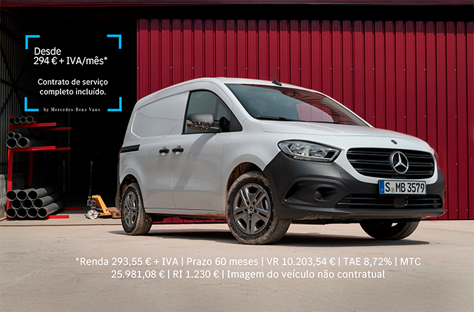 *Exemplo para Citan Furgão Standard BASE 110CDI/27 em contrato Select & Drive de Locação Financeira Mobiliária com prazo contratual de 60 meses com valor mensal 293,55 €+IVA, Renda Inicial (RI) 1.230 €, e Valor Residual (VR) 10.203,54 €, 20.000 Km por ano, Taxa Anual Nominal (TAN) Fixa de 5,55%, Montante Total do Crédito (MTC) 25.981,08 €, TAE 8,66%, Montante Total Imputado (MTI) 33.492,74 €. Contrato de serviço com valor mensal de 29 €+IVA incluído no valor da renda e na TAE, e que inclui Manutenção preventiva e corretiva, serviços de Assistência 24H e MobiloVan. Acresce comissão de ativação de 395 €. Despesas de legalização e transporte incluídas. Consumo combinado estimado (l/100km): 5,2. Emissões CO2 combinadas (g/km) 135. Campanha válida para Clientes Profissionais e contratos ativados até 31.12.2025 e sujeita à aprovação da Mercedes-Benz Financial Services Portugal SFIC, SA, com registo no Banco de Portugal nº 0306.