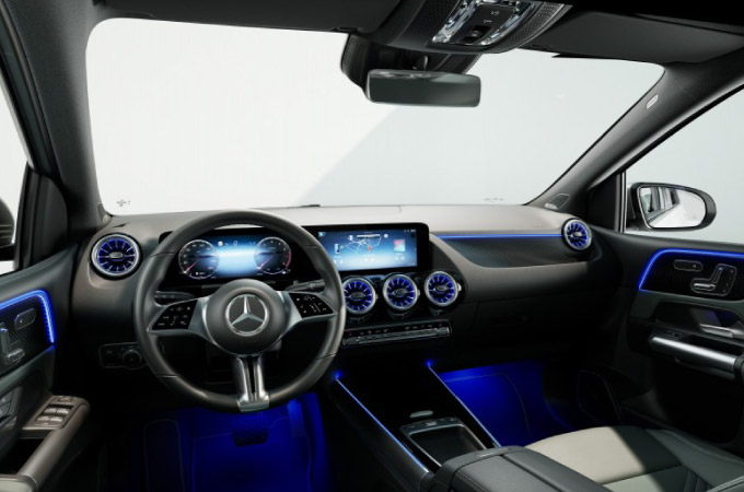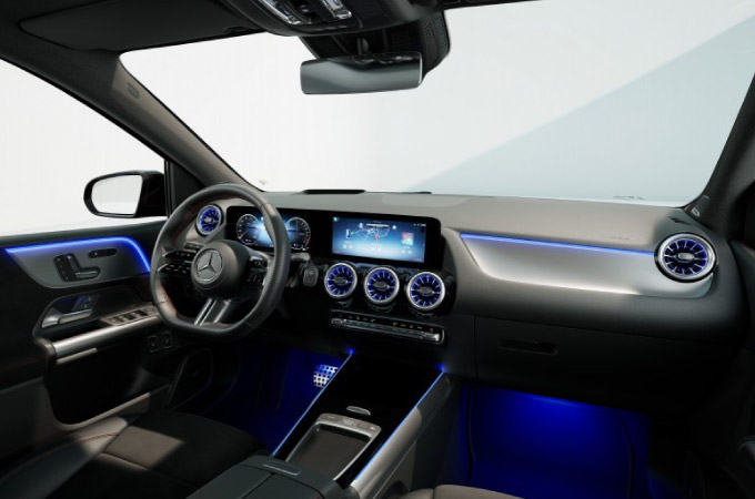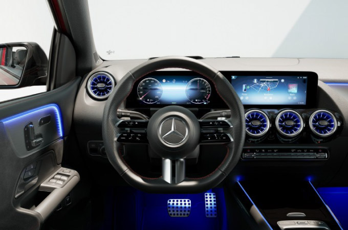 Entre a alta tecnologia e a desportividade: o interior do novo Classe B é extremamente prático e espaçoso. O posto de condução é dominado pelo ecrã duplo (painel de instrumentos de 7 polegadas e o ecrã central de 10.25 polegadas), que está incluído de série. Na versão opcional com dois ecrãs de 10.25 polegadas, é criada uma impressão de ecrã largo que aparenta flutuar. As três saídas de ventilação redondas em forma de turbina, tão características da Mercedes-Benz, são uma homenagem ao mundo da aviação. A consola central com novo desenho transmite as aspirações de alta tecnologia do novo Classe B através do seu visual Black Panel, enquanto o novo volante da última geração está revestido de série em pele napa.