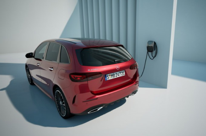 Mais potência para as versões híbridas plug-in: as versões híbridas plug-in do novo Classe B (Mercedes-Benz B 250 e, consumo de combustível em ciclo combinado 1.2-0.9 l/100 km, consumo de energia elétrica em ciclo combinado 17.4-15.4 kWh/100km, emissões de CO2 em ciclo combinado 27-20g/km) [2] beneficiam do aperfeiçoamento da bateria de alta tensão. O processo de carregamento também foi otimizado: além da potência de 3.7 kW de série, a bateria aperfeiçoada pode agora também ser carregada com corrente alternada com uma potência de até 11 kW, ao invés dos 7.4 kW do modelo antecessor. Além disso, os clientes continuam a ter a opção de carregar a bateria com corrente contínua e com uma potência de até 22 kW. Um carregamento com corrente contínua desde um estado de carga de 10 até 80 % demora cerca de 25 minutos, proporcionando uma experiência de carregamento sem complicações, especialmente durante a utilização no dia a dia. O motor elétrico no novo Classe B também foi revisto e atinge uma potência de 80 kW após o aperfeiçoamento - um aumento de 5 kW.