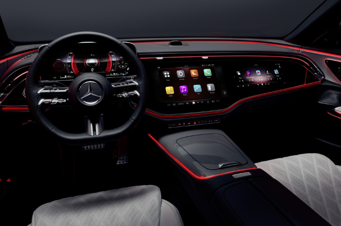 Com a nova Iluminação Ambiente Ativa com Visualização de Som, os ocupantes do novo Classe E podem experimentar música com três sentidos: a música em geral e o som de aplicações podem ser ouvidos (com tecnologia Dolby Atmos® se pretendido), sentidos (através de transdutores de ressonância do opcional sistema de som surround Burmester® 4D) e agora também "visualizados". A visualização ocorre na faixa de luz da Iluminação Ambiente Ativa (opcional). Por exemplo, músicas com batida rápida podem causar rápidas variações de luz, enquanto os ritmos normais podem criar combinações suaves de ambientes de iluminação.