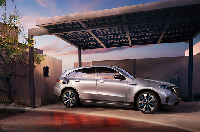 O EQC pode ser carregado com 7,4 kW (AC) nas estações públicas de carregamento ou em casa. Outra opção mais rápida: Pode receber até 110 kW numa estação de carregamento rápida (DC). Em cerca de 40 minutos*, a bateria pode ser carregada de 10 a 80% de SoC (Estado de Carga). (* Os tempos de carregamento representam 10 a 80% da bateria total ao utilizar uma estação de carregamento rápido DC com potênciade carregamento com pelo menos 110 kW)