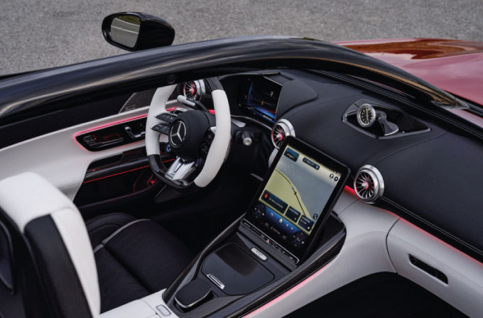 O habitáculo do PureSpeed combina conforto e exclusividade, com bancos AMG Performance em pele especial, um volante AMG de dois tons e um relógio analógico personalizado da IWC Schaffhausen no painel de instrumentos. O sistema de som Burmester de alta qualidade com 15 altifalantes garante uma experiência sonora imersiva.