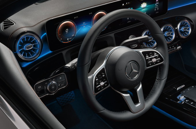 Desfrute da sensação de imersão. As transições entre o painel de instrumentos, a consola central e os revestimentos das portas são fluidas e criam o agradável design "wrap-around". Trata-se de um aspeto deste segmento tão exclusivo como a seleção de elementos decorativos e a iluminação ambiente com até 64 cores, que realça o interior.